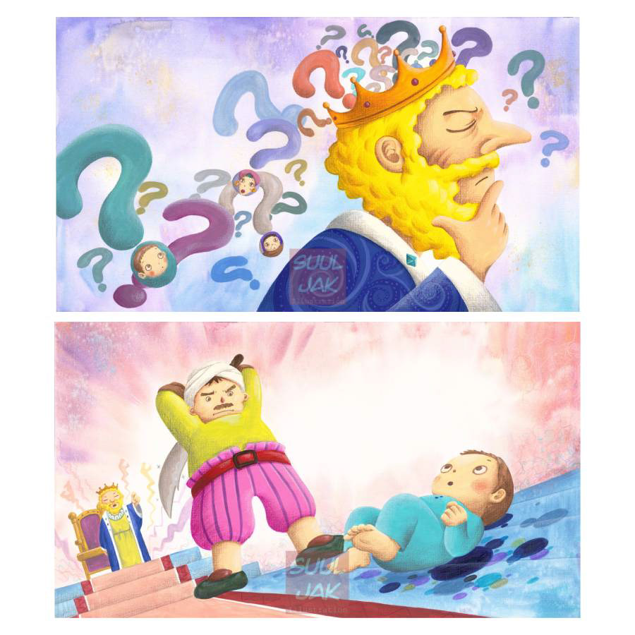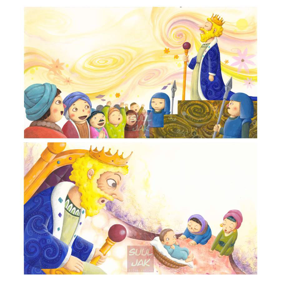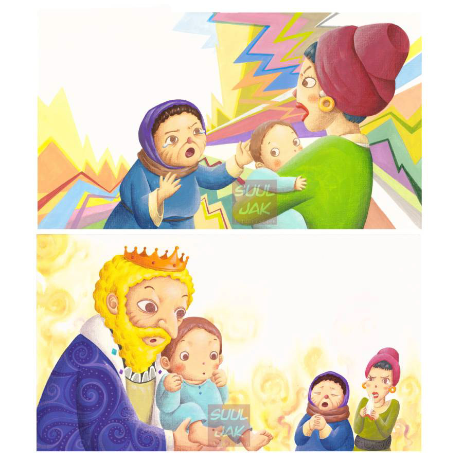 탈무드의 솔로몬 왕에 대한 그림책입니다. 아기에게 진짜 어머니를 찾아주기 위해 솔로몬은 어떤 현명한 판단을 했을까요?