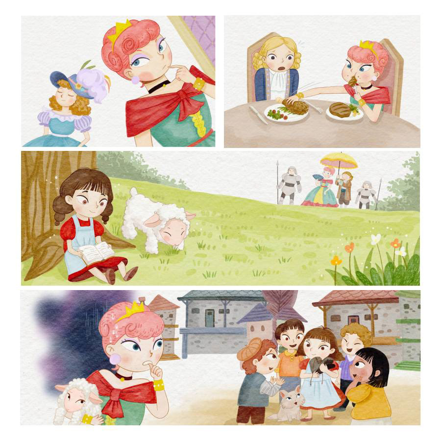 The princess, who is jealous of others' things, also takes away a girl's lamb.